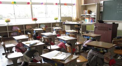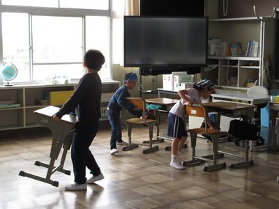 「地震が発生しました」の放送で、みんな静かに机の下へ。