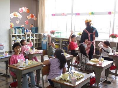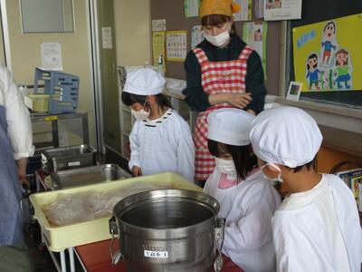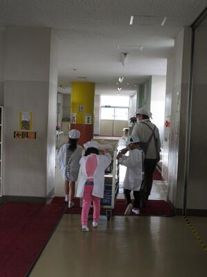 給食当番の子どもたちが上手に配膳し、もらう子たちもトレーを両手でしっかり持って上手に受け取っていました。