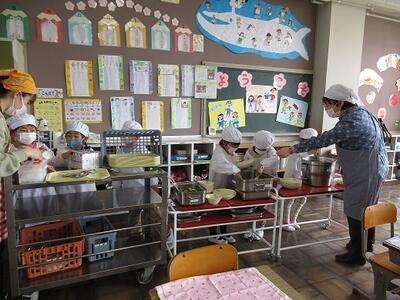 小学校での初めての給食は、カレーライス。少しずつ確認しながら配膳にも挑戦しました。