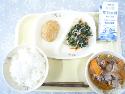 本日のメニューは、「ご飯」、「牛乳」、「豆腐ハンバーグおろしソース」、「おひたし」、「豚汁」です。ハンバーグにかけるものには、ケチャップやデミグラスソース、チーズなどがありますが、今回は「おろしソース」です。大人っぽいメニューかなと思いましたが、子供たちもほとんど残さず食べています。今日も美味しくいただきました。ごちそうさまでした。