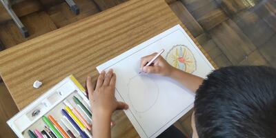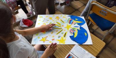1年生は、「図工」の授業です。色画用紙をやぶいた形から何ができあがるのでしょうか。グループで話し合っています。
