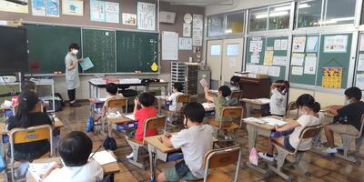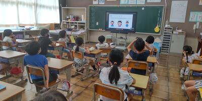 一年生は外国語活動の授業です。隠れている果物の名前をあてています。