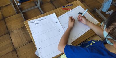 4年生は、「図工」の授業です。作品カードを記入しています。工夫したのはどんなところかな。