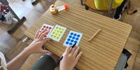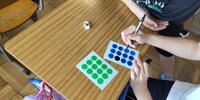 3年生は、「図工」の授業です。円形の紙を重ねてわりピンでとめて回すと、様々な「ランド」が現れます。