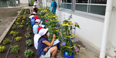 1年生は「音楽」の授業です。この後、「しろくまのジェンカ」を皆で踊るのですね。2年生は「生活」の授業です。観察をしています。すでに実を付けた野菜もありますね。