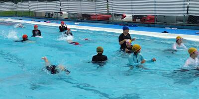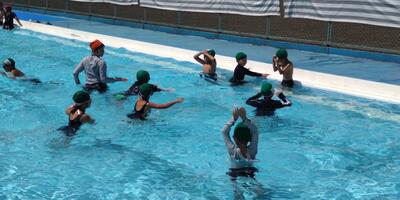 そして「体育」の授業です。新型コロナウィルス感染症予防のために距離をとり、熱中症予防のため早朝より注水して水温を確認して授業を行っています。本日の3校時の水温は、28℃でした。