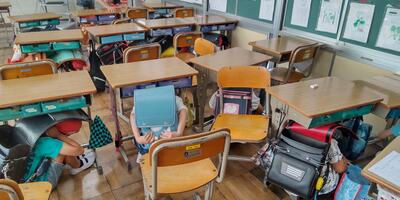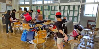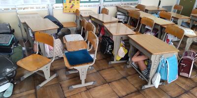 赤白帽子をかぶりランドセルを背負い、廊下側に寄せた机の下にもぐります。子どもたちは、担任の先生の指示に従い落ち着いて行動することができました。安全が確認されたのち、担当の先生から、「竜巻が発生するのはどんなときか」「竜巻から身を守るためにすること」についてお話がありました。