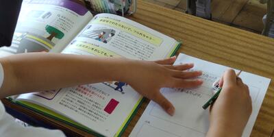 2年生は、「書写」の授業です。今日のめあては「おれのほうこうに気をつけてかこう」です。「日」「草」「子」の折れの違いに気づくことができたでしょうか。