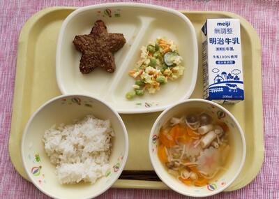 今日は「七夕メニュー」です。星形ハンバーグにはごまがたっぷりのソースがかかっています。サラダには星形チーズが入っています。七夕汁には、そうめんを天の川に見立て星形のかまぼこも入っています。お星さまづくしのメニューです。今日の夜は、お星さまがよくみえるといいですね。