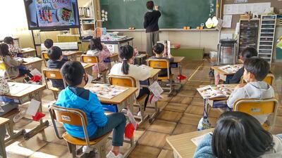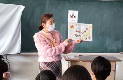 町の学校栄養教諭の小林陽子先生を講師にお招きし、1年生と5年生が「食に関する指導」をしていただきました。