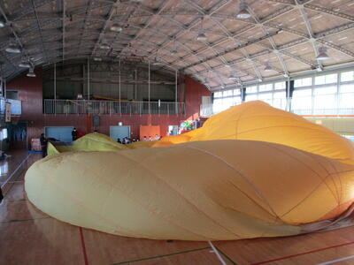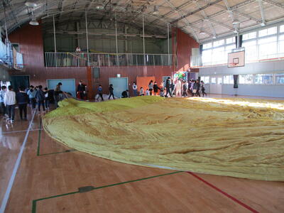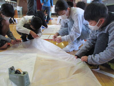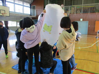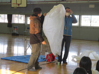 最後に、本物の気球の一部を膨らませていただきました。内部に入った子どもたちは、その大きさに驚いていました。貴重な体験をさせていただきまして、ありがとうございました。