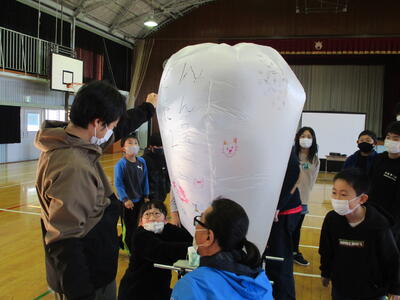 気球について説明をしていただいた後、グループに分かれ、ミニ気球を作りました。出来上がった気球をバーナーで暖めると、あっという間に体育館の天井に上がっていきました。