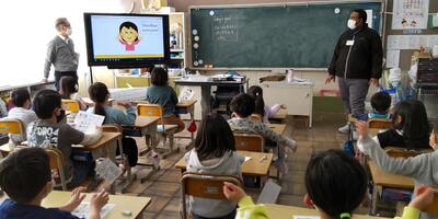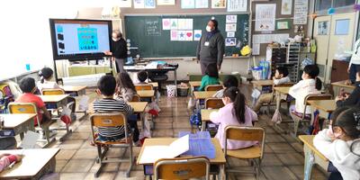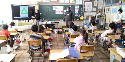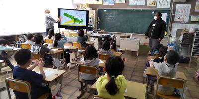 清水先生、中村先生、チトコ先生の「ALL ENGLISH(すべて英語)」での質問に正確に、そして自信をもって答えている5年生のこどもたちです。