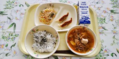 今日の給食は、阿久津小学校6年2組の皆さんの「リクエスト給食」です。ナムルや春巻きで野菜がたくさんとれますし、本当にみんなが大好きな物ばかりです。ありがとうございました。