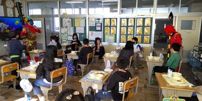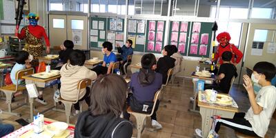 給食の時間を利用して、鬼が教室にお邪魔して豆まきをしました。新型コロナウイルス感染症拡大防止の観点から、「鬼は外、福は内」のかけ声は心の中で言うこととし豆もまかないで行いました。