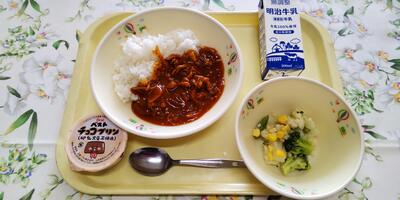 今日の給食は「節分メニュー」です。カレーに噛み応えのある大豆が入っています。昔の人は、病気や災害などは悪い鬼が持ってくると信じていました。そこで節分には「魔物の眼を射る」という意味の炒り大豆をまいたそうです。