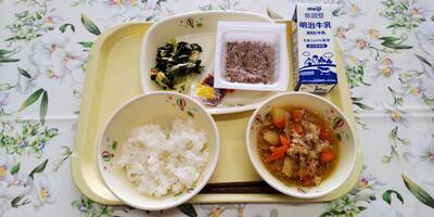 今日の給食は、ひじきの炒り煮です。ひじきは、乾燥ひじきとして1年中出回っている商品ですが、旬は3月から4月です。骨や歯をつくるために必要なカルシウムが多いだけではなく、作られた歯や骨を健康に保つために必要なマグネシウムも多いので、成長期の小中学生には進んで食べてほしい食品です。