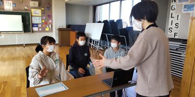 町内2中学校のALTであるマシュー・グラハム 先生、メリッサ・グラハム 先生、ジョナサン・チア 先生の3名の先生方からの自己紹介や母国紹介の後、紹介にかかわるクイズや質問に答えてくださいました。