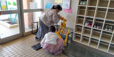 ④靴箱にきちんとくつを入れたら、手を洗います。