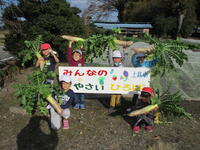 13日(金)に、1,2年生が大根の収穫を行いました。「大きなかぶ」の話まではいきませんが、大きく、大きく育った大根を、児童は、協力して収穫していました。