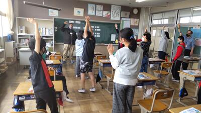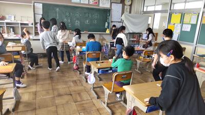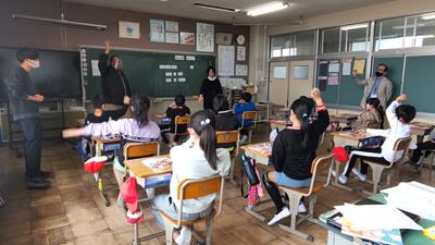 英語専科の清水先生、JTEの中村先生、ALTのチトコ先生、担任の4名体制での外国語科の授業が始まりました。いろいろな授業に少しずつ慣れてきた子どもたちです。5年生は、外国語活動と外国語科の学習の違いを、清水先生に説明していただきました。2年生は生活科の学習です。これから、春を探しに行きます。