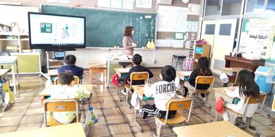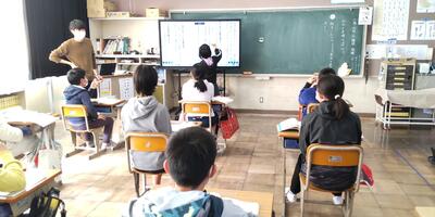 3年生は「外国語活動」です。チトコ先生の質問に答えています。
