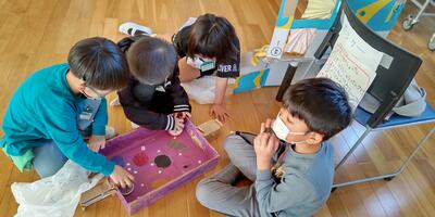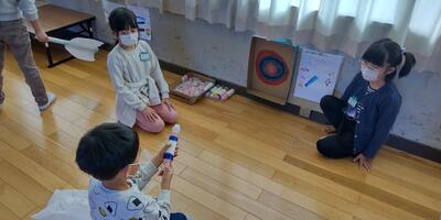 2年生が、「おもちゃランド」に、1年生のみなさんとともにご招待くださいました。空気砲や割りばし射的、ホッケーなど、それぞれ工夫を凝らしたおもちゃの数々。2年生がおもちゃの遊び方を1年生に説明すると、1年生は、おもちゃの作り方を質問していました。