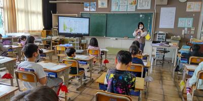 1年生は生活科の時間です。学校の中を見ています。どんなものが見つかりましたか。