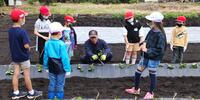 毎年苗をご提供いただいている相澤久雄 様、学校用務員の野中功 先生に、美味しいさつま芋になるための苗の植え方を教えていただきました。苗を植える道具は、子どもたちのために相澤様が自作して、お持ちくださいました。