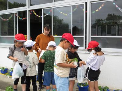 1年生が植木鉢のアサガオの間引きをしました。