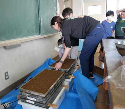 総合的な学習の時間「お米を作ろう」で、5年生が「ゆうだい21」の種をまきました。