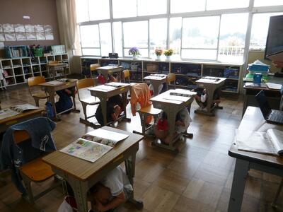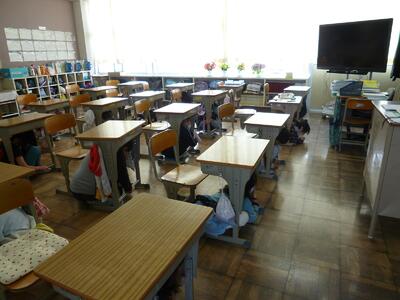 「地震が発生しました」の放送で、みんな静かに机の下へ。