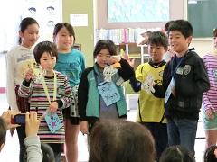 4年生は、「みんなにやさしい町づくり~福祉について考えてみた~」の題名で発表しました。グループに分かれ、点字・バリアフリー・手話にについて調べました。点字を打ったり、車いすに乗ったり、手話による歌や会話など実演を交えてわかりやすい発表でした。招待された3年生や保護者の方は貴重な体験ができました。