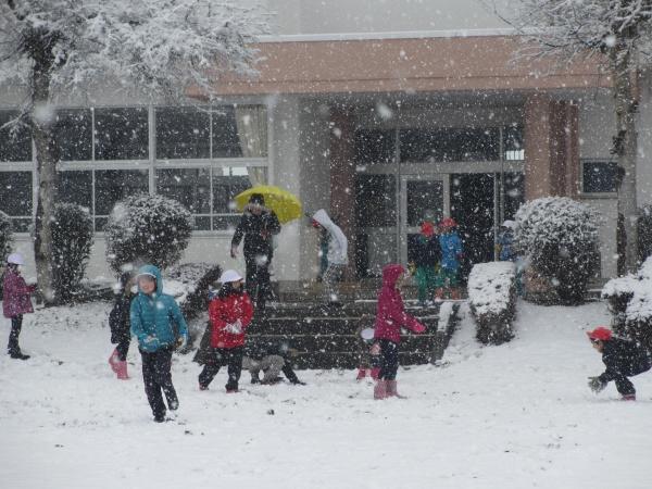 今日は、今年初めての本格的な雪。子どもたちは朝から雪に大喜びです。