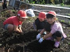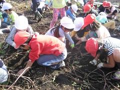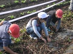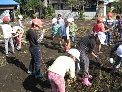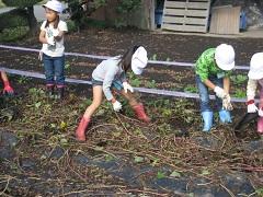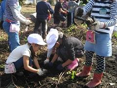 1・2年生が、学校農園で自分たちが植えたさつまいもの収穫をしました。大きくて、おいしそうなさつまいもがたくさん掘れました。