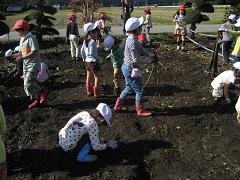 1年生がチューリップ交流を行いました。町更正保護女性会の方々が来校し、一緒にチューリップの球根を植えました。チューリップの花言葉は「正直」とか「思いやり」だそうです。来春にきれいな花が咲くのが楽しみです。