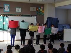 今朝の朝の活動は、児童集会を行いました。今回は、保健給食委員会の企画です。内容は、かぜ予防に関してです。まず、かぜ予防のポイントの説明があり、その後クイズが出題されました。最後に、ふれあい班ごとにかるたの最初の文字を考えました。わかりやすい発表で、かぜ予防に対する子どもたちの意識が高まりました。