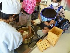 3年生が自分たちで育てた大豆を使って、豆腐作りに挑戦しました。ゲストティーチャーとして直井さんに来ていただき、指導してもらいました。みんなで協力して作った出来たての豆腐は、たいへんおいしかったです。