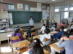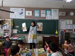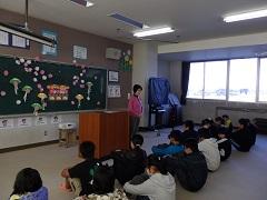 町立学校給食センターの学校栄養士が来校し、1年生に対して食指導が行われました。内容は、食事のマナーに関する話でした。