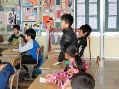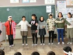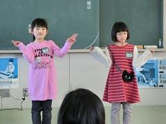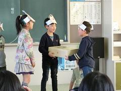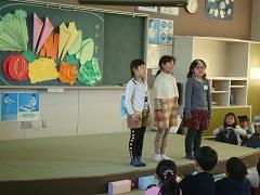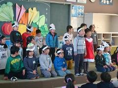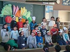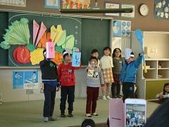 1・2年生がのびのび保育園との交流会を行いました。1年生は、劇「サラダでげんき」を上演しました。その見事な演技に保育園生も見入っていました。劇の後には、好きなサラダを一人一人発表しました。なお、この授業は、表現力養成講座の発表も兼ねています。