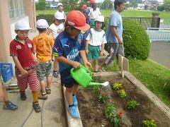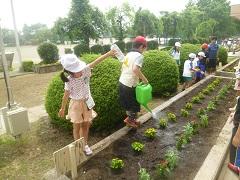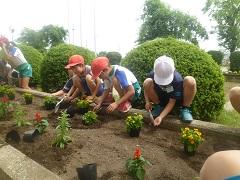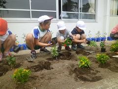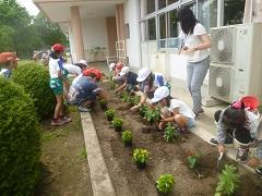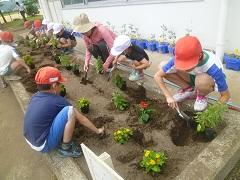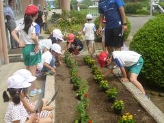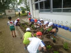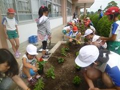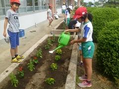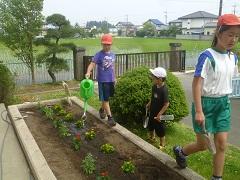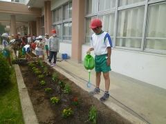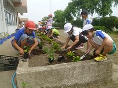 昼休みにふれあい花壇に苗の植え付けを行いました。サルビア、ブルーサルビア、メランポジウムを6つの花壇に班ごとに協力して植えました。植え終わった後は、たっぷりと水をかけました。