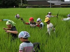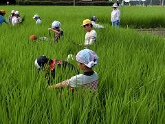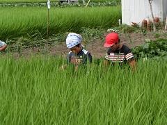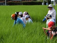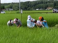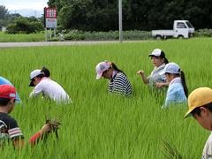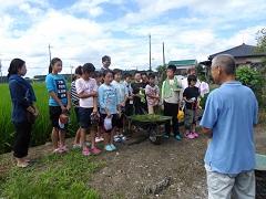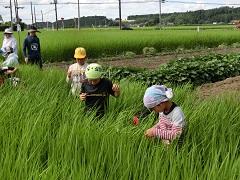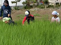 環境ボランティアの赤羽さんの指導の下、田の草取りを行いました。夏休み中のため、都合がつかない児童もいましたが、多くの児童が参加しました。暑い中でしたが、集中して作業を行ったので、予定より早く終了しました。児童の送迎に協力してくれた保護者の皆さま、ありがとうございました。