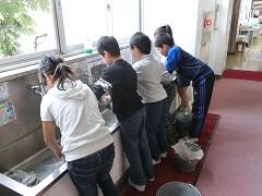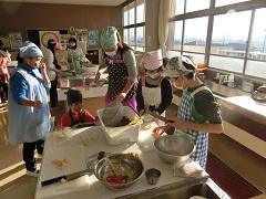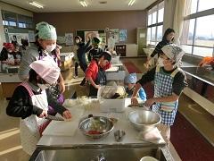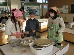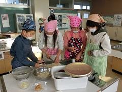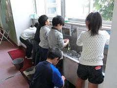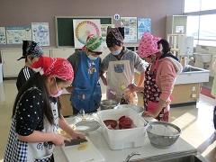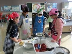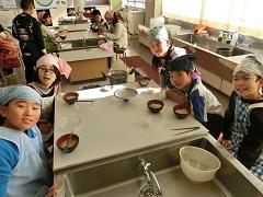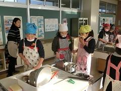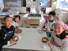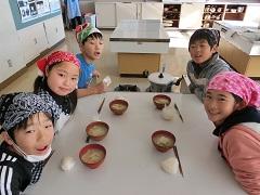 5年生が家庭科の調理実習で、ご飯を炊き、みそ汁を作りました。みそ汁は、煮干しでだしをとり本格的な味です。ご飯は、小さなおにぎりにしました。どの班も協力しておいしいみそ汁が完成しました。