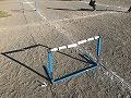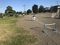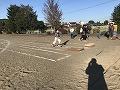 校庭を、各種運動ゾーンに区分けし、用具等を工夫しています。投力向上を目指したⅹジャイロやロケットボールの活用。低学年・高学年に分けたドッジボールゾーン。野球ゾーンにサッカーゾーン縄とびゾーン等を設けて行っています。