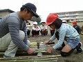 ビオトープのひょうたん池の魚たちが、サギなどの鳥に食べられてしまい、現在はほとんどいなくなってしまいました。そのようなことを話したところ、学校支援ボランティア(もの作り)の見目智史さんが、自宅の竹を利用して、魚の隠れ家を作ってくれました。最後の組み立てとくぎ打ちは、1、2年生の児童と一緒に行いました。初めてくぎを打つ児童もいましたが、見目さんに教わりながら楽しくくぎ打ちをしていました。