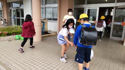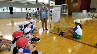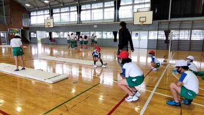 入学して二か月の1年生。小学校生活にも慣れてきました。今日は体育館で「ラジオ体操第一」や「走る運動」です。