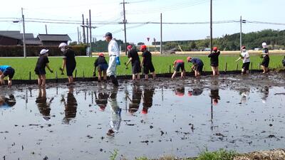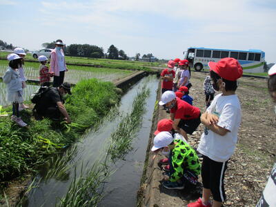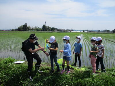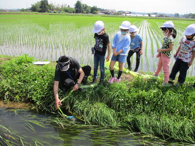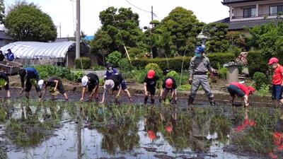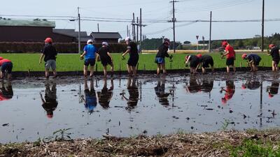 まず最初に環境ボランティアの赤羽啓一様から「ゆうだい31」の苗の植え方について教えていただきました。田んぼの中に入り、苗を3本ずつ持って植えました。足をいれたところはきちんとならしておかなければいけません。2時間かかって田植えが完了しました。これから、除草、稲刈り、乾燥、販売等まで、様々な活動を通して、一粒の重みを体得していきます。田植え後のふり返りでは「『いただきます』の意味が少しわかったような気がします。」と記している子がいました。
