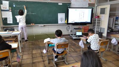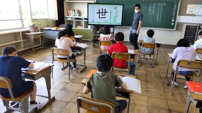 2年生は、算数の学習です。いよいよ「㎜(ミリメートル)」の学習が始まります。はがきのたてと横の長さを測ることで今まで学習してきた「㎝(センチメートル)」では表せないことに気づきます。さあ、どうしたらよいか、その切実さが算数の面白いところといえるのでしょうか。