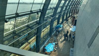 出口です。記念写真を撮ろうとしています。自然の神秘、偉大さを実感し、みんなの心もさらにきれいに洗われたような、すがすがしい表情をしています。