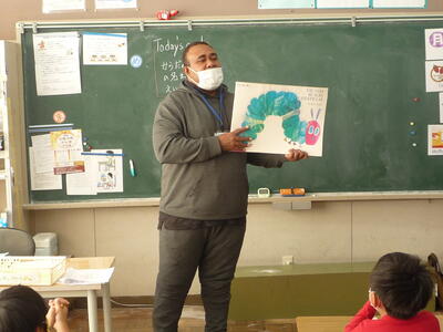 中村先生、チトコ先生が、英語で読み聞かせをしてくださいました。2年生がよく知っている「はらぺこあおむし」を読んでくださいました。